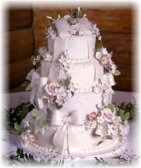 A wedding cake is the traditional cake served to the guests at a wedding breakfast, after a wedding. It is usually a large cake, multi-layered or tiered, and heavily decorated with icing, occasionally over a layer of marzipan or fondant, topped with a small statue representing the couple. Other common motifs include doves, gold rings and horseshoes, the latter symbolising good luck.