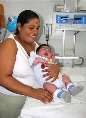 In January 2005, a Brazilian baby arrived weighing 7.6kg. According to the Guinness Book of World Records, the heaviest baby was a boy born to a healthy mother in Italy in September 1955 weighing 10.2kg.