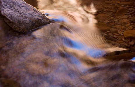 Water rippling in a stream in Fern Glen Canyon reflects the brightly lit red rocks of the canyon walls