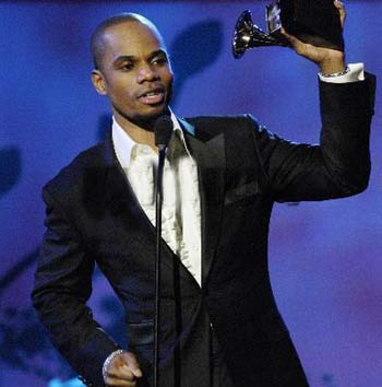 Kirk Franklin holds the Grammy award for Best Gospel Song for “Imagine Me” during the telecast at the 49th Annual Grammy Awards in Los Angeles Feb. 11, 2007