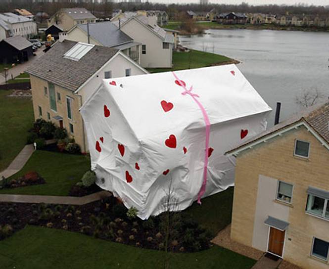 The man, Jasin Boland, used 1,524 m2 of wrapping paper and a 23 m long pink ribbon to cover the million dollar house for his fiancée, Maria Moral Pena.