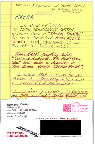 Mark “Hollywood” Hatten claims he “willfully gave a sperm sample to then girlfriend Anna Nicole Smith, which she gave to a doctor for future use.” He then writes, “I allege that I could be the father of Dannielynn by means of artificial insemanation .”