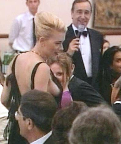 Scarlett Johansson , an American actress who can rival Lindsay Lohan showcasing their breast would be her revealing side breast in her dashing evening gown and even her nipple too.