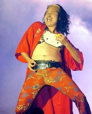 Interesting StuffThe funky man David Jung or C Diddy ripped through his personal air guitar verson with fun-filled Hello Kitty breast plate red satin wear outfit
