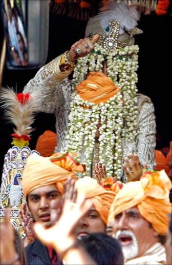 The marriage procession is a customary for the bridegroom to travel to the bride’s house on a horse, accompanied by his family members.It is a rare but elaborate three-day ceremonies of Aishwarya Rai and Abhishek Bachchan’s wedding. The sangeet, india’s cultural singing with instrumental accompaniement held at Amitabh’s bungalow in suburban Juhu , Prateeksha.The guest lists are of media and film personalities , India’s rich and famous , politicians , industrialists and of course huge turns of their feverished fans.