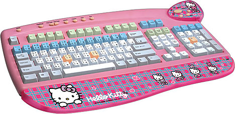 This Hello Kitty keyboard is a traditional keyboard in pink with a purple wrist support which features the entire color range endorsed by Hello Kitty herself.