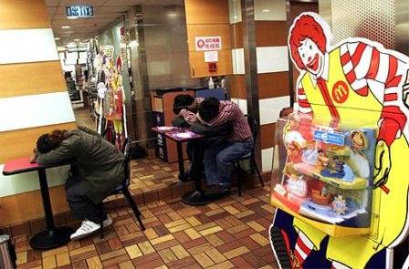 “I had lost my job for about a month. I have no money to pay my rent, so I come here to sleep,” a Hong Kong man tells the Apple Daily. “It has air conditioning here. It’s better than sleeping in parks.” In addition, the fast food chain has also become a new playground for “McGamers” – people who play portable games such as PlayStation Portable and Nintendo DS for hours in McDonald’s.