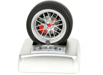 Looking for unique alarm clock ??? This is a car wheel alarm clock which comes with an alarm that will not only wake you to the sound of a roaring engine but will do so whilst spinning the out part of the tire, with the alarm being silenced by means of slipping the gear stick into neutral.