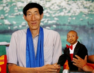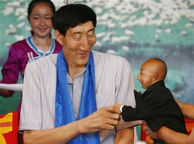 He Pingping, measures 73 centimeters (2 feet and 5 inches) shakes hands with just married world’s tallest man, Bao Xishun, who stands 2.36 meters (7 feet and 9 inches), in Baotou, China’s Inner Mongolia Autonomous Region on July 13, 2007. He Pingping, 19-year-old, congratulated Bao Xinshun for his first marriage.