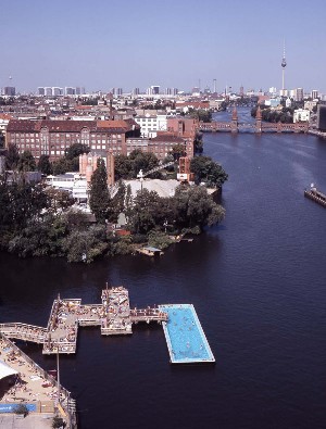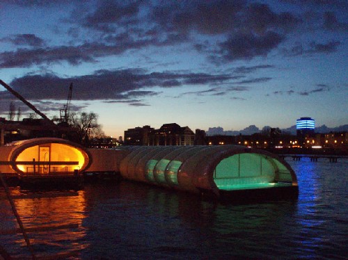 The a floating swimming pool “Badeschiff” in Berlin Treptow is a swimming pool with stylish roof that placed on a ship on the river Spree. This floating swimming pool was designed by Berlin artist Susanne Lorenz. The pool is in rectangle shape, and the size is 32.5 meters long, 8.2 meters wide and 2 meters deep.