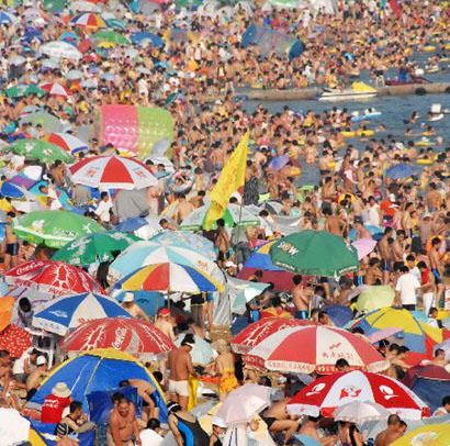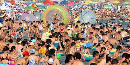 A heat wave with the temperature rising to 34.5 degrees centigrade hit Dalian, northeast China Liaoning province, on July 29, 2007. Due to the extremely hot weather, beach in Dalian became the most popular place for the local citizens as well as the tourists. They thronged the beachside to cool themselves. As a result, the beach became overcrowded that is very rare scene in Dalian beach.
