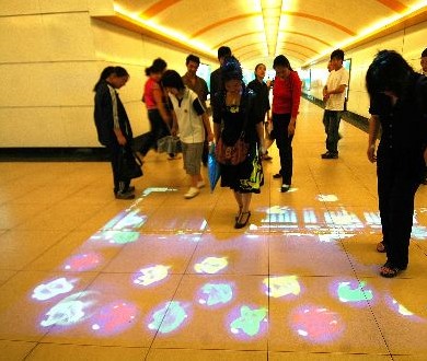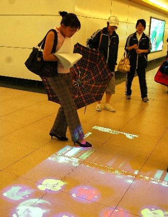 This is a very creative and good idea to decorate the floor, no just with painting but with colorful cartoon shadows. People were enjoying all kinds of colorful dynamic shadows of cartoon images in an underground passage in Hangzhou, Zhejiang Province.