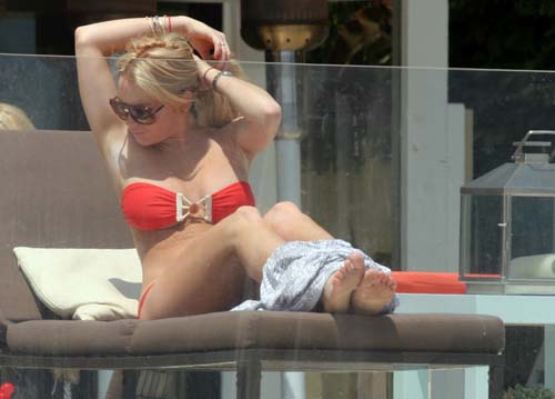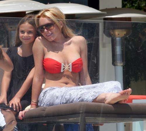 Lindsay Lohan looked relaxing and in very good mood. When saw the camera shooting her, she smiled to the camera, waved hand and showed “victory”. She was so friendly but the most attractive one still Lindsay Lohan’s sexy little red bikini.
