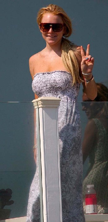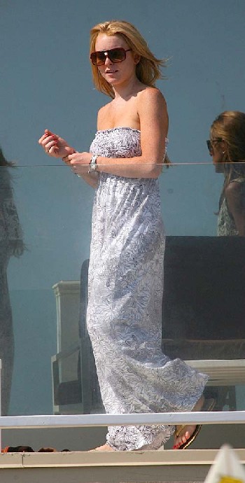 Lindsay Lohan spent her weekend on July 24, 2007, relaxing at the Polaroid Beach House in Malibu. She wore a long strapless dress with her favourite big sunglasses and later stripped down to her sexy red bikini for sunbathing.