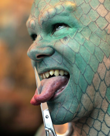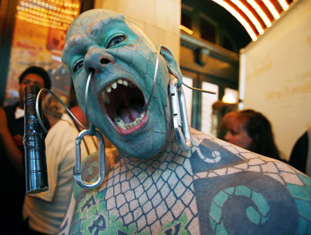 Ripley’s Believe It Or Not! Odditorium grand opening in Times Square in New York on June 21, 2007. Many of the oddity people and world records holders were invited to the grand opening. One of them was Erik Sprague, who tattooed his entire body and with the split tongue is more famous and known as The Lizard Man.