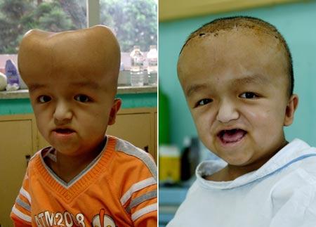 He received a 13-hour surgery on July 15, 2007 and the surgery was very successful, he is in stable situation now. The photos took on August 2, 2007 show his deformed skull before and after surgery.