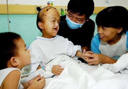 Liu Jing, 9-year-old, is an unlucky boy whose has deformed skull when he was born. He was suffering from hydrocephalus at his birth and later the deformed skull. And the good news is he looks normal now after a surgery to reconstruct his deformed skull at a hospital in Xiamen, China.
