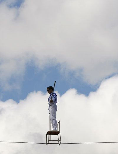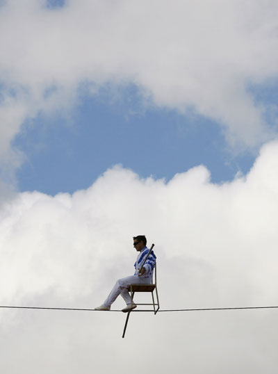 Columbian circus acrobat Henri Ayala was trying to set the Guiness World Record by balancing on a chair on a high wire out of doors. He performed his stunt by standing and sitting on a chair on a high wire 68ft up above a circus tent during an attempt at England on August 7, 2007.