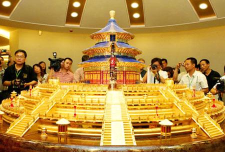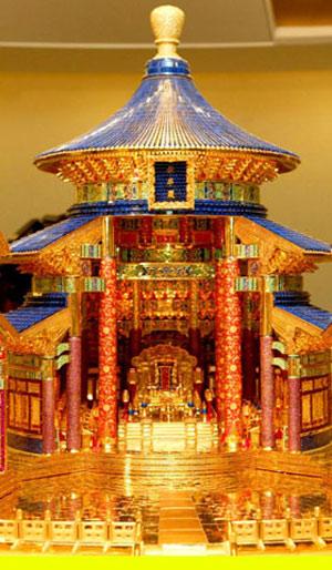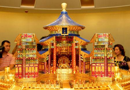 A diamond miniature Hall of Prayer for Good Harvests within the Temple of Heaven is being exhibited at an art and crafts exhibition in Guangzhou, China on August 10, 2007. It is 1.38 meters high and was made by 200-thousand diamonds and precious stones. This miniature Hall Of Prayer is able to open its door automatically; visitors can look at its interior and also view of how an ancient emperor held a reverent petition ceremony.