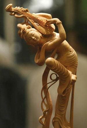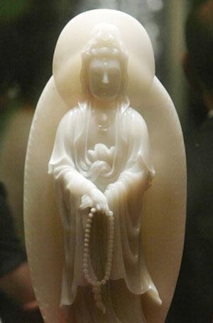 Other than the diamond miniature Hall of Prayer, many valuable artworks made of jade and wood are also on exhibit. The photos below show a jade sculpture of Guanyin and a sculpture made of wood in the exhibition.