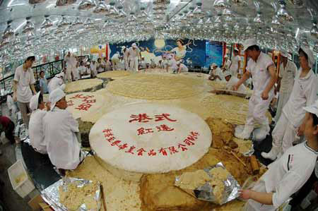 In conjunction with forthcoming mooncake festival, ten Chinese cooks spent about ten hours to make a 13-ton giant mooncakes. This is the biggest mooncake ever made by a super food market in Shenyang, China.