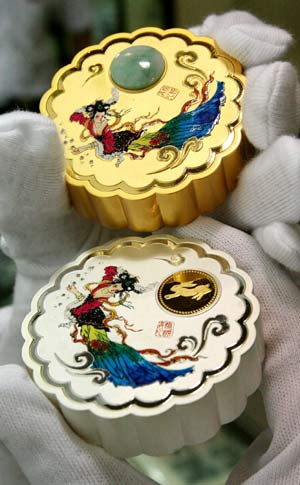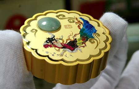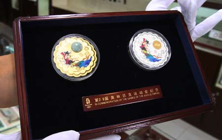 Two types of exclusive commemorative medals of Beijing 2008 Olympic were displayed in Beijing on August 21, 2007. This is a flower-shaped medal using two types of materials, gold and jade, gold and silver. The commemorative medals also called “Olympic Moon Cakes” simply because it looks like a moon cake.