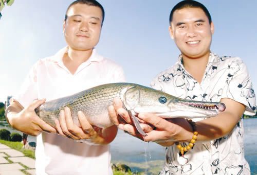 The strange fish is 90-centimeter long and 3-kilogram in weight. According to experts, it is a spotted gar, a ferocious predator which originates in the Americas and is raised by many as a pet. However, it is very rare in China.