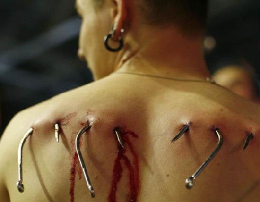 Hooks were pierced through the skin of the performers’ back; they then suspended by the hooks. In another performance, a man carrying a woman when he was suspended on hooks pierced. Most audiences were shocked with their performance. See some photos of the men suspended by hooks pierced below.