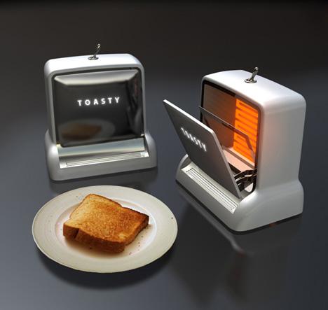 This gadget is cool! I like it because it is a cute toaster with its exclusive design. This is the Toasty Single Serving Toaster, which was designed by Arthur Wu.