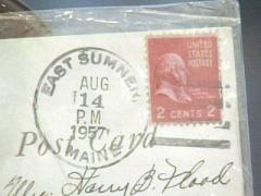 A mysterious woman, Alice from East Sumner, Maine sent the postcard to Harry Flood on August 14, 1957. At the back of the card, Alice wrote, “See you next week”.