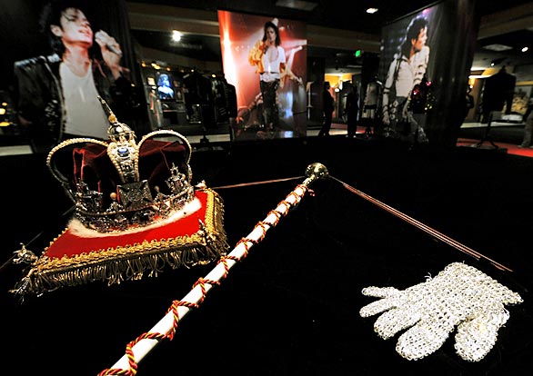 Michael Jackson's crown, ceremonial scepter and jewel-encrusted glove on display in Beverly Hills were saved from an auction after a legal settlement in April 13, 2009.